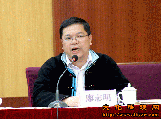 百色市瑶族民间文化研究会秘书长廖志明通报会议筹备工作情况。(韦汉国 摄)